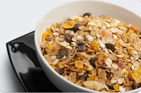 A nourishing granola bowl includes crunchy granola, a choice of creamy yogurt or milk, fresh fruits, nuts, seeds, and raisins for a wholesome and satisfying breakfast or snack.